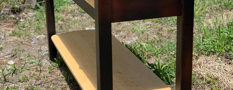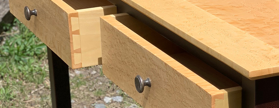 Blissmade Lakehouse console table with hand rubbed Birdseye maple drawer fronts/top and a black crackle over red casework that has a tasteful aged effect. All of the fitting and joinery on this piece was done by hand including the hand-cut dovetails in the drawers and the hand scraped surfaces.