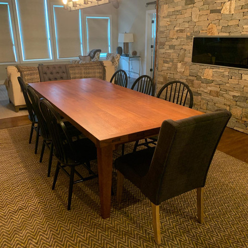 Absolutely massive red oak dining table, 3" thick, custom milled by Blissmade from a single oak tree cut down on the customer's property. It showcases oversize pegged mortise and tenon construction with a sturdy undercarriage, breadboard ends, tapered legs, and a long-lasting lacquer finish.